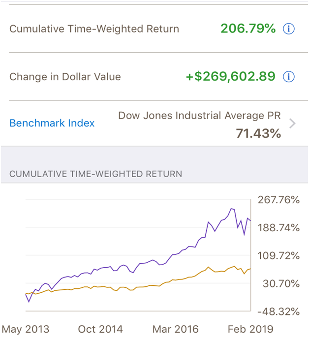 My portfolio is up 206% in six years while the Dow Jones is up 71% at the same time (figure below). Almost three times above the market rate of return.