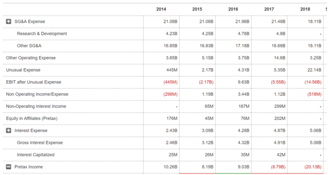 I finally regained my sense when I looked below the top line. Look at the pretax income. It’s blood red. From 9 billion profit to 20 billion loss in just two few years. GE says it is because of the unusual expense. It’s not unusual when it happens every year and is growing (see the figure below). This indeed would be a red flag had I looked at its financials.
