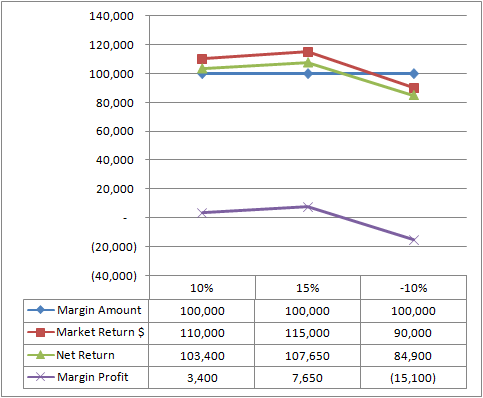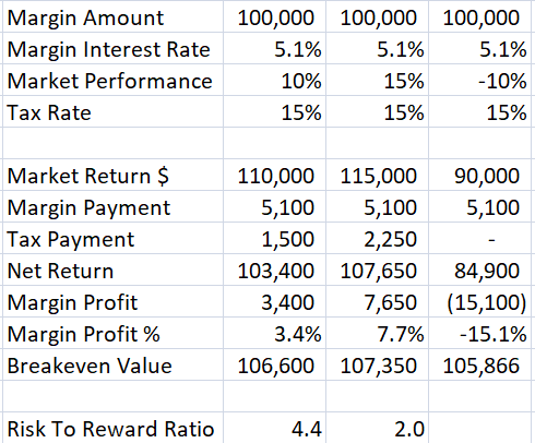 A margin amount of $100,000 with an average market performance of 10% (assuming a margin rate of 5.1%) yields 3.4% profit. While a -10% performance yields -15.1% loss. This gives a risk to reward ratio of 4.4.