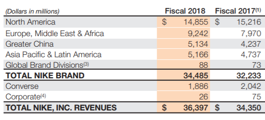 Nike’s revenue was 27 billion in 2014, and it rose to 36 billion in 2018. Majority of its revenue comes from North America. Analysts hav a huge concern about it since the growth in this geographical reason is slowed down. But, I have high faith in the stability and authenticity of the North American market.