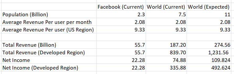 Assuming all the world population join the Facebook community, the total revenue will be 187 billion. And, let’s look at seemingly a perfect scenario. Assuming the expected peak of 11 billion population will join the Facebook community in the future, and all the world population will be developed, Facebook will earn 1.2 trillion dollars a year.