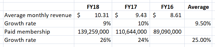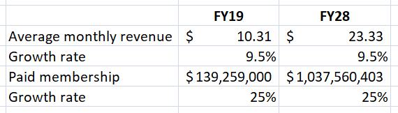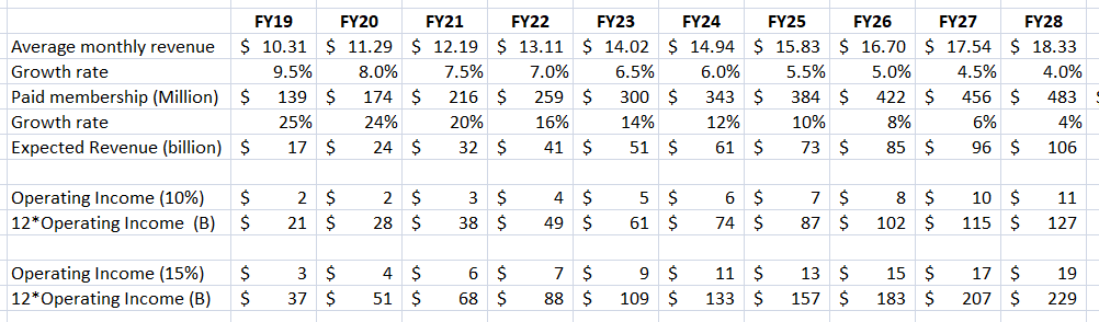 You will get over a billion members and average monthly revenue of $23.33 (figure below) in FY28 if you apply the average growth rate. Even though Netflix’s core strategy is to grow their streaming membership business globally within the parameters of their operating margin target, it is highly unlikely that in FY28 they will have over a billion paid members. Nevertheless, the average monthly revenue might be possible dependent on inflation and other factors. These two numbers are inversely proportional to each other. It is hard to grow them both at the same pace. You have to either sacrifice average revenue to get the paid members or vice versa.
