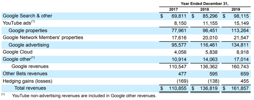 The portion of their revenues that they derive from non-advertising revenues is increasing and may affect margins. For example, Google Cloud, Google Play, Hardware products and YouTube.