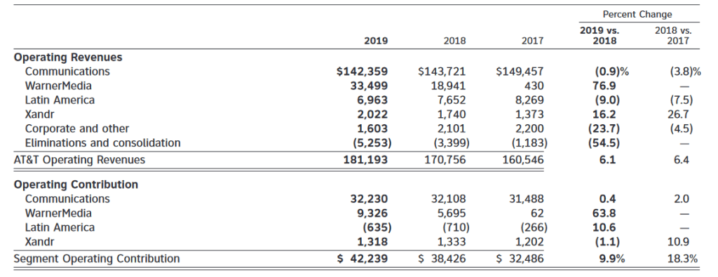AT&T’s communication sector is still strong; its growing. However, the DirectTV is dragging the revenue down. The new CEO, John Stankey, is trying to offload that segment and, currently, the rumor is that they are getting offers above $15 billion for that segment.