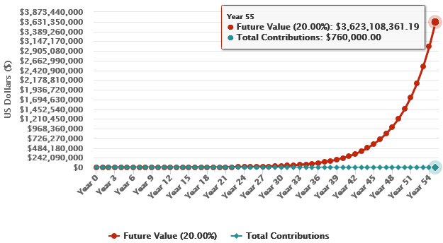 So, instead of compounding $100,000 for 55 years at 10% rate if you compound it at 20% rate, you will get an astonishing $3.6 billion dollar. Yes, correct. It is not a typo. It is billion with B. This is outrageously large.