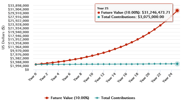 2.7 million compounding from year 30 till year 55 i.e 15 years at 10% rate yields you $31 million.
