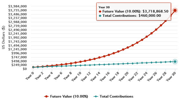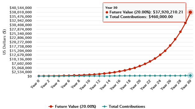 Now, lets assume you only have 30 years instead of 55 years to compound your $100,000 at the same 20% rate, you will only get $37 million versus $3.7 billion.