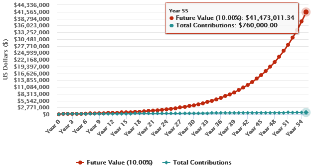 The same $100,000 compounding for 55 years at 10% without any interruption gives your $41 million.
