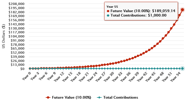 Let’s say you manage to save $100,000 and if you compound that $100,000 for 55 years at 10% rate, you will get $18.9 million.