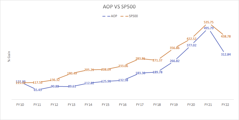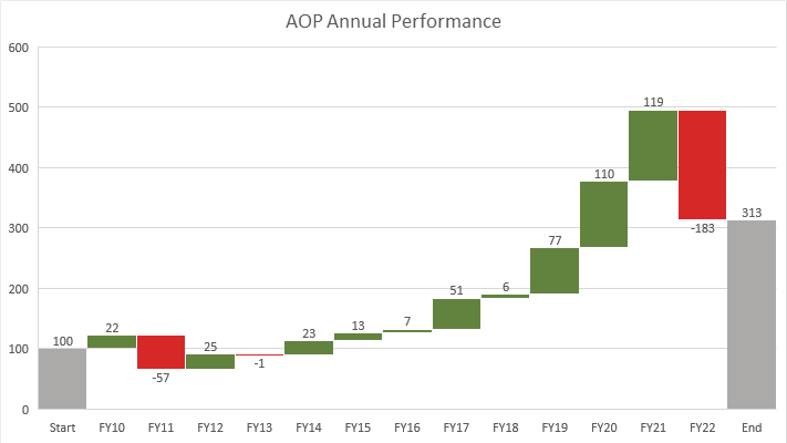 Starting August of 2010, $100 invested in AOP and S&P500 will be $313, and $439 respectively. We surely would be better-off buying the index and doing nothing, but our willingness to play this loosing game has never gotten stronger.