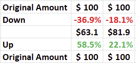 Here is what he meant in figures (see below). We need 58.5% gain just to reach our original balance, whereas the index just needs 22.1% gain to get to the same level.
