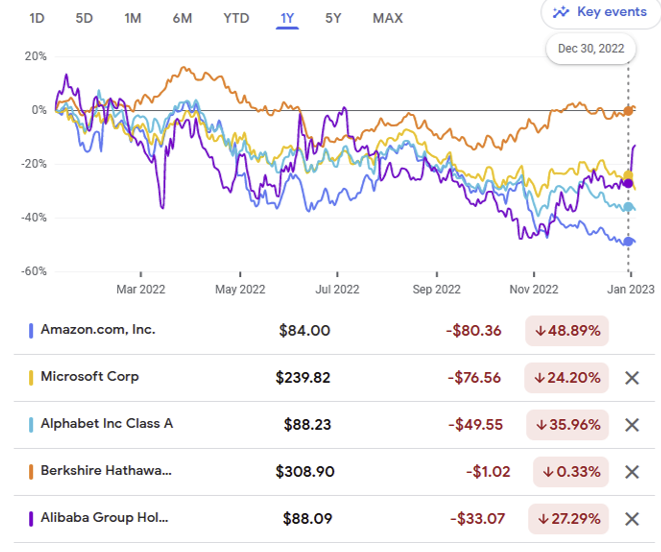 I am counting on my darlings: Berkshire Hathaway, Amazon, Alibaba, Alphabet and Microsoft to positively impact my return in 2023.