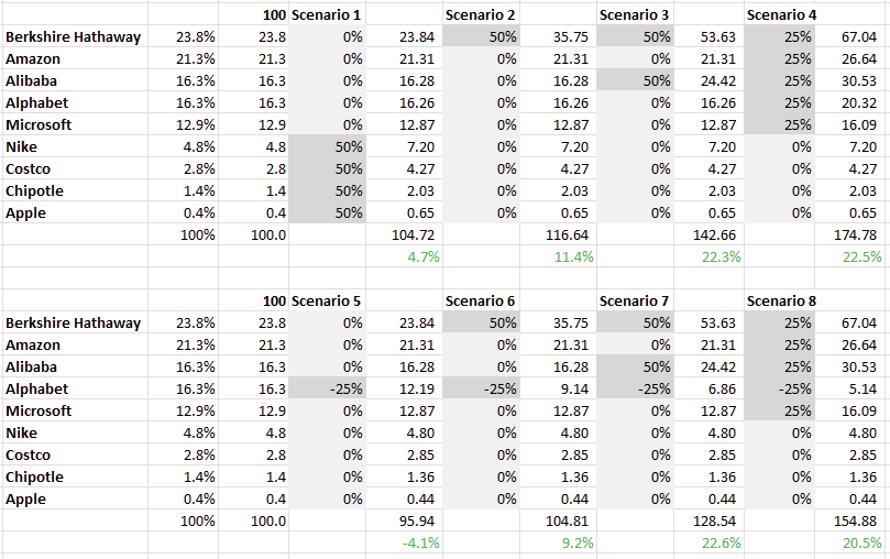 Mathematically speaking, even substantial change in Nike, Costco, Chipotle and Apple stock price will not materially impact my overall performance because their allocation is quite low.
