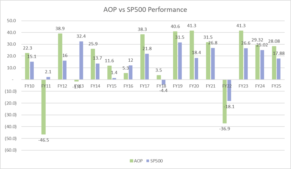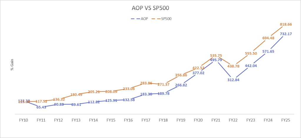 $100 invested in AOP vs S&P500 since the inception date. S&P will yield you almost 100% better performance.
