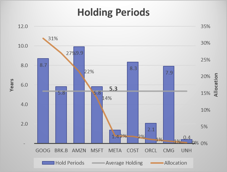 Our favorite metric, i.e. average holding period has increased to average of 5.3 years. Our longest held investment is Amazon. Amazon is in our retail shop since 2016. Almost a decade and almost 10 bagger. This year, we initiated a small position in United Healthcare (UNH), which brought down the holding period by a little bit. More on this on our future posts.